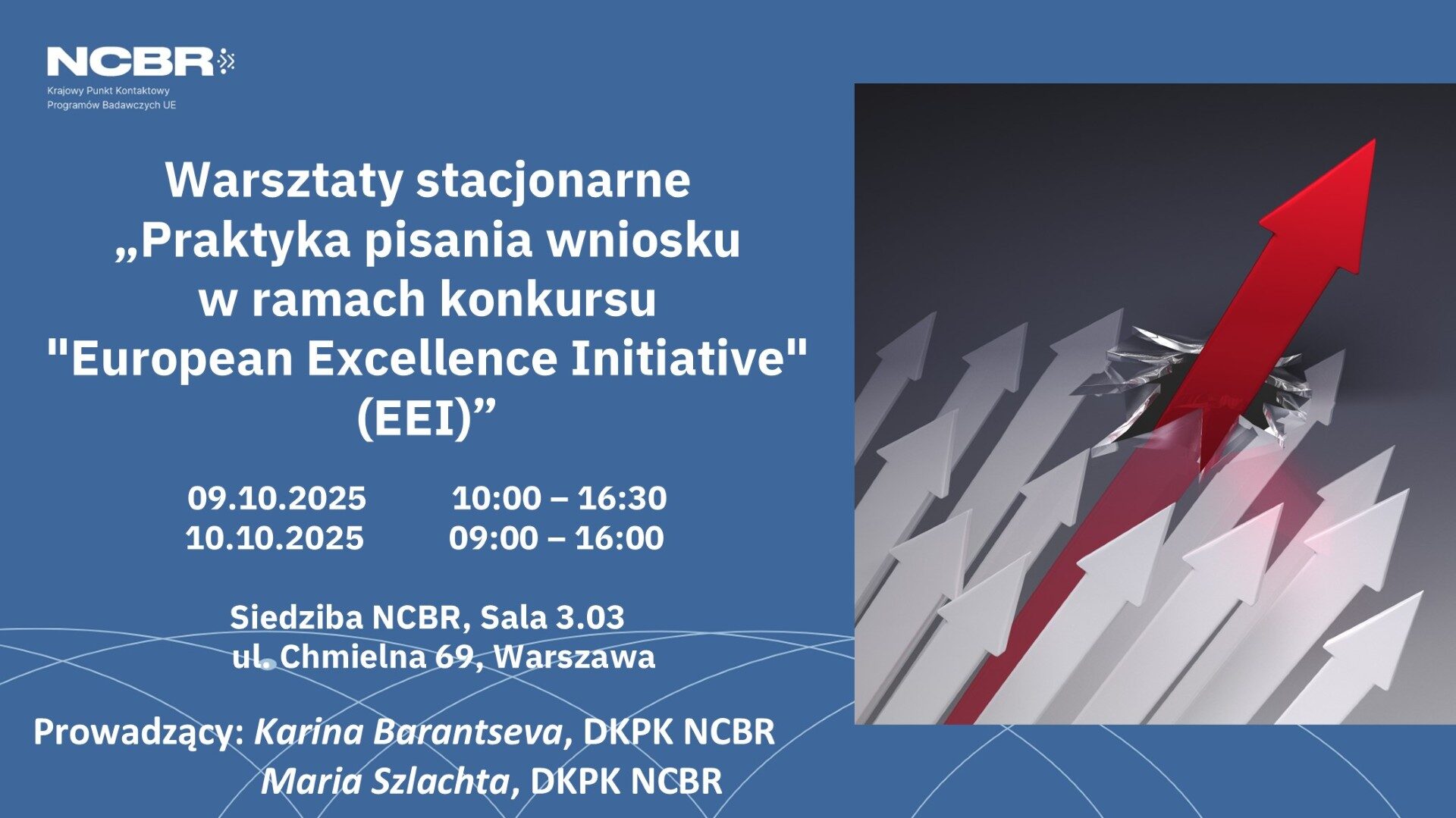 Krajowy Punkt Kontaktowy przy NCBR zaprasza na dwudniowe warsztaty stacjonarne poświęcone praktycznemu przygotowaniu wniosku w konkursie European Excellence Initiative (EEI) w ramach programu Horyzont Europa. Spotkanie odbędzie się 9-10 października 2025 r. w siedzibie NCBR w Warszawie (ul. Chmielna 69, sala 3.03).