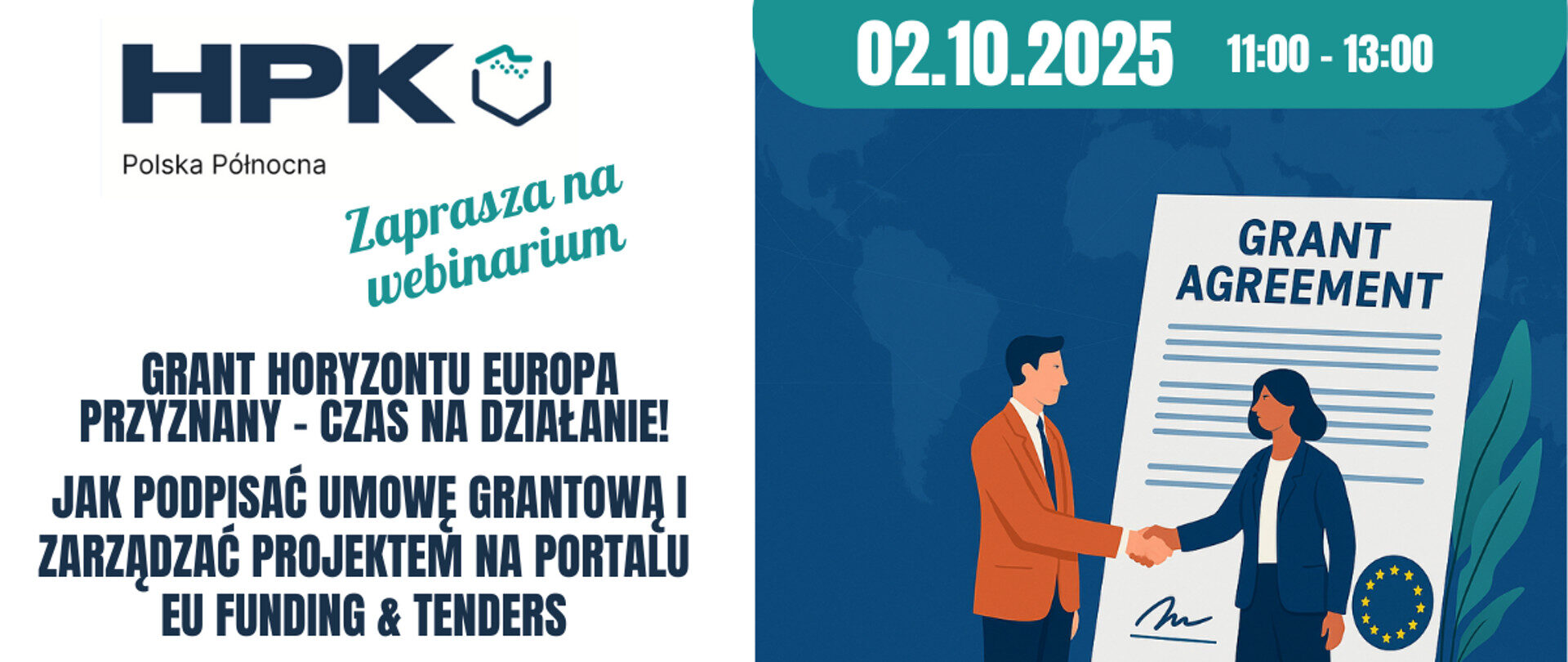 „Grant Horyzontu Europa przyznany – czas na działanie! Jak podpisać umowę grantową i zarządzać projektem na Portalu EU Funding & Tenders”, które odbędzie się 2 października 2025 r., w godz. 11:00-13:00, na platformie ClickMeeting.