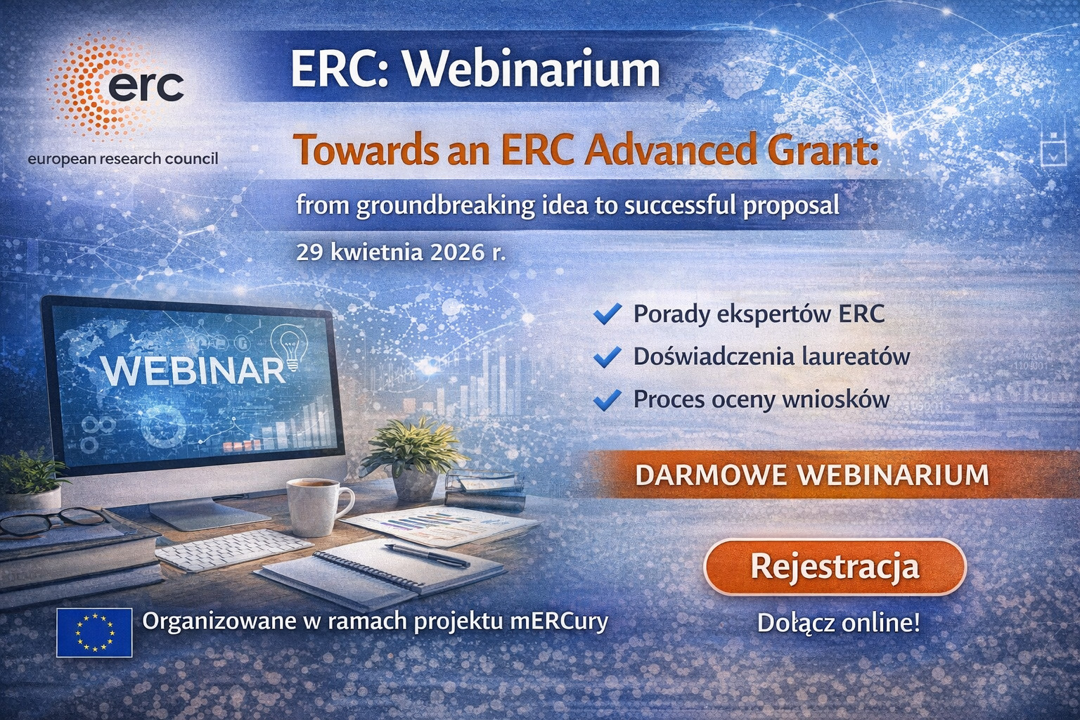 Zapraszamy na międzynarodowe webinarium dla badaczy zainteresowanych konkursem ERC Advanced Grant 2026, organizowane w ramach projektu mERCury – inicjatywy sieci Krajowych Punktów Kontaktowych w obszarze ERC (European Research Council).